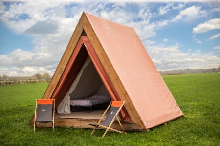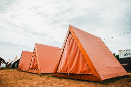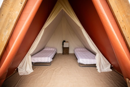 - la location d'une tente avec un plancher en bois pour 2 personnes comprenant 2 lits préparés, 2 chaises de plage, une table, un miroir, une lampe, tapis et une alimentation électrique