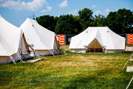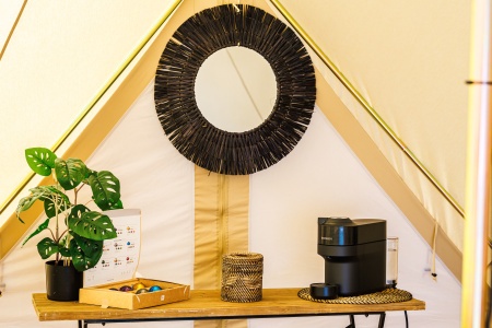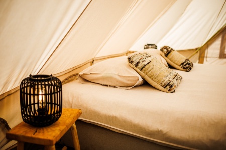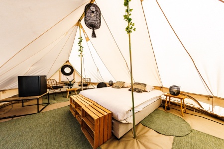 - la location d’une tente pour 2 personnes comprenant 2 lits boxspring préparés avec couettes et oreillers, tables de chevet avec lampe, une lampe, boîtes de rangement, tapis, canapé, coin salon et une alimentation électrique