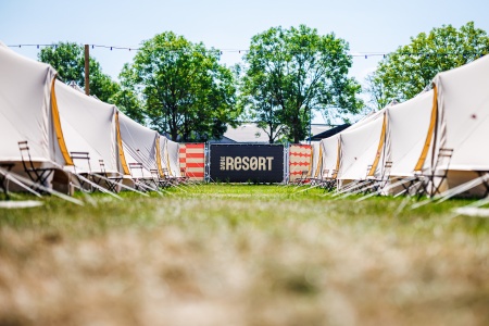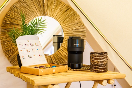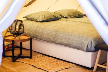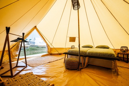 - la location d’une tente pour 2 personnes comprenant 2 lits boxspring préparés avec couettes et oreillers, tables de chevet avec lampe, une lampe, boîtes de rangement, tapis, canapé, un portant à vêtements, coin salon, chaises à l’extérieur, chauffage et une alimentation électrique