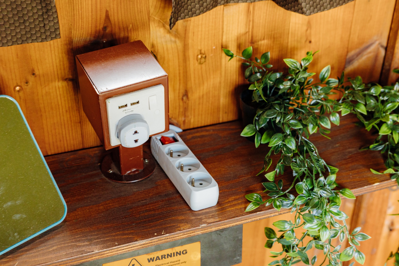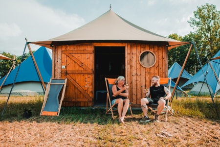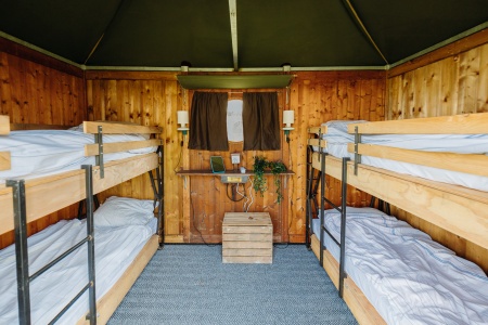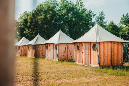 - la location d’une accommodation avec un plancher en bois pour 4 personnes comprenant 4 lits préparés, une lampe de chevet, une table, un miroir, une porte verrouillable et une alimentation électrique