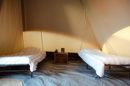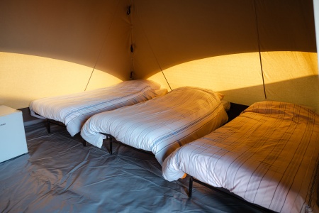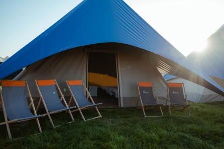 - la location d'une tente avec tapis de sol pour 5 personnes comprenant 5 lits préparés, 5 chaises, une table, un miroir et une lanterne