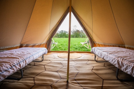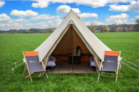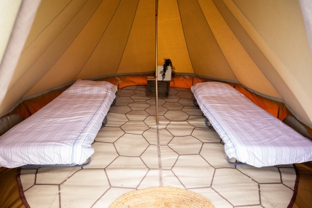 - la location d'une tente avec tapis de sol pour 2 personnes comprenant 2 lits préparés, 2 chaises, une table, un miroir et une lanterne