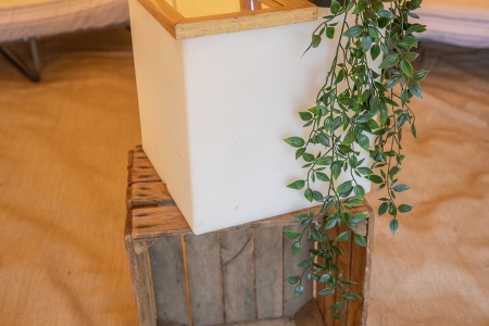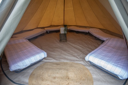 - la location d'une tente avec tapis de sol pour 6 personnes comprenant 6 lits préparés, 6 chaises, une table, un miroir et une lanterne