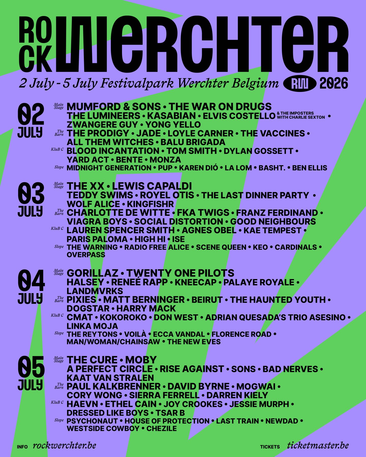 Er zijn zowel combi- als dagtickets beschikbaar voor Rock Werchter 2026. De dagtickets voor zaterdag 4 juli en zondag 5 juli zijn uitverkocht, een wachtlijst is geactiveerd.